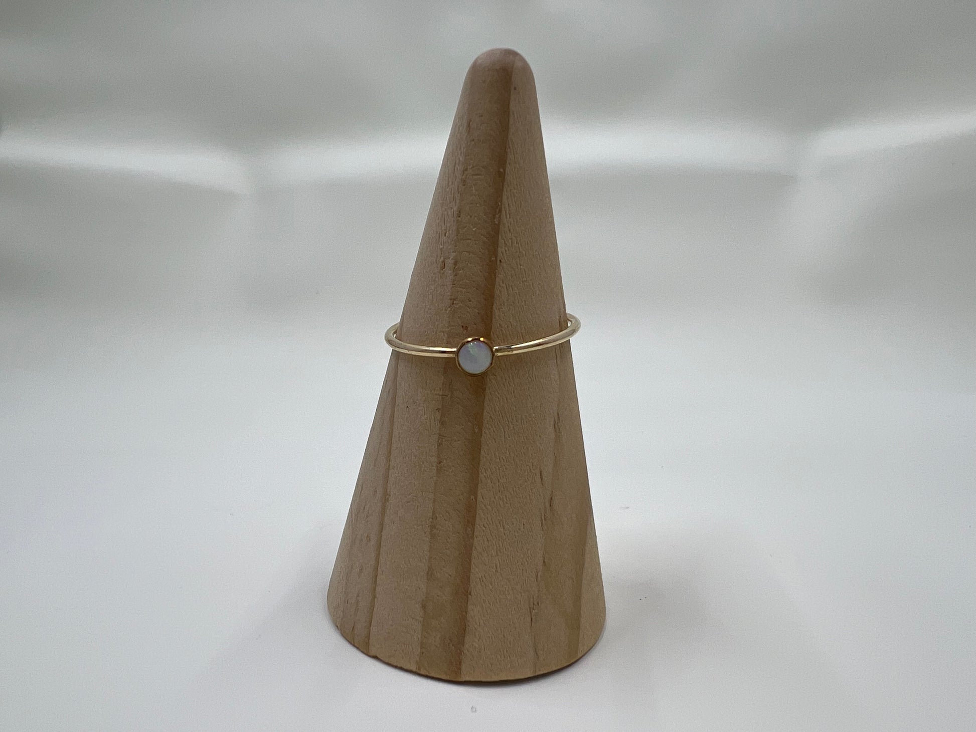 This ring has a 3 mm opal and is 14 karat gold filled. Gold filled materials have a thin layer of 14 karat gold on the outside and will not tarnish or change colors.