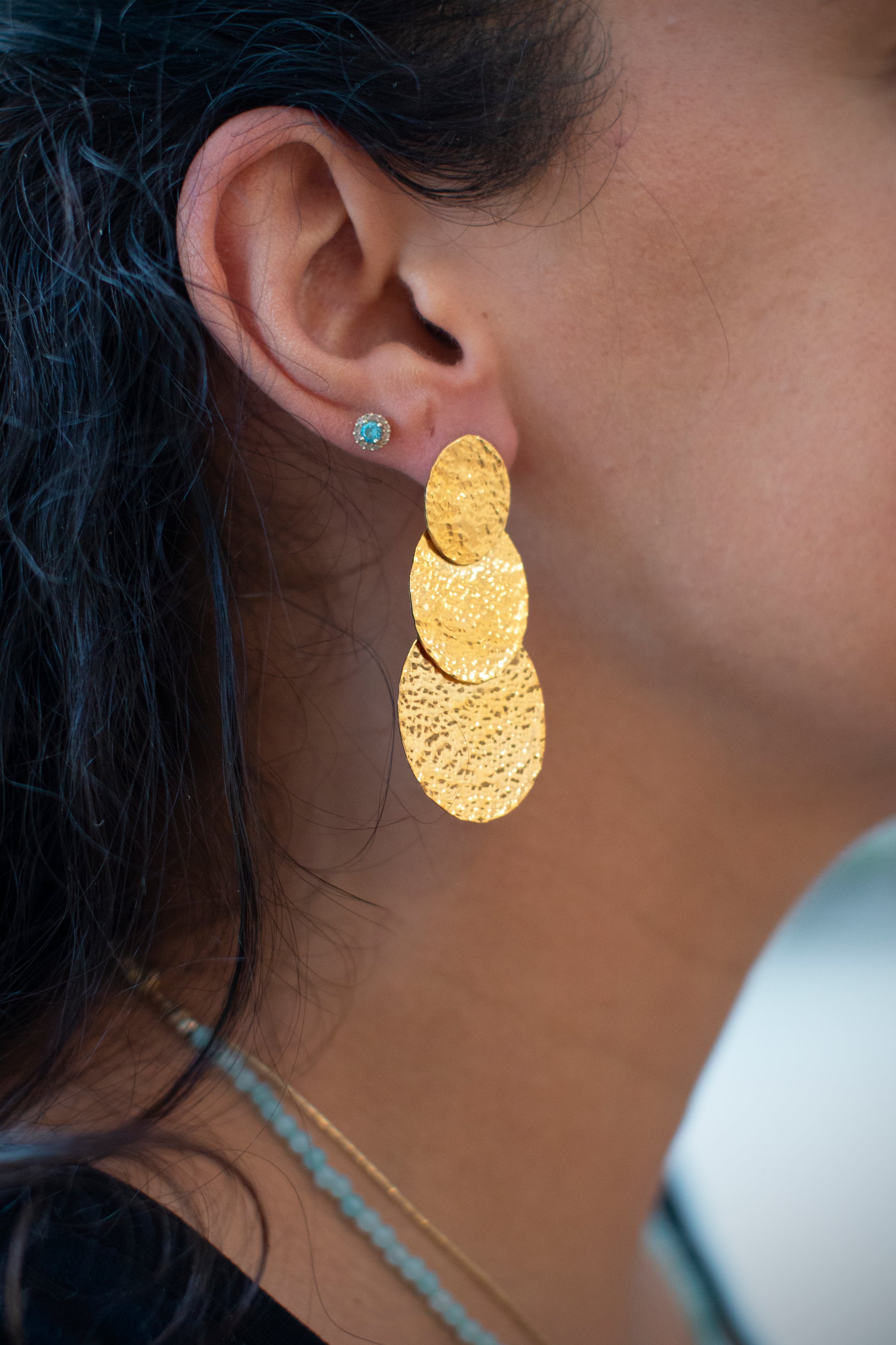 24 karat gold vermeil oval earrings. These earrings are entirely handmade. My starting materials consist of sterling silver sheet metal and wire. Gold vermeil is a highly tarnish resistant material; a thick layer of gold is put over sterling silver. Unlike gold plated metals, gold vermeil will not tarnish or change colors.